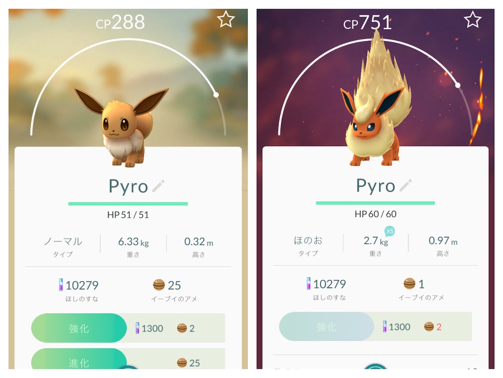 進化用のアメがたまると進化のボタンがアクティブになり進化させることができます。